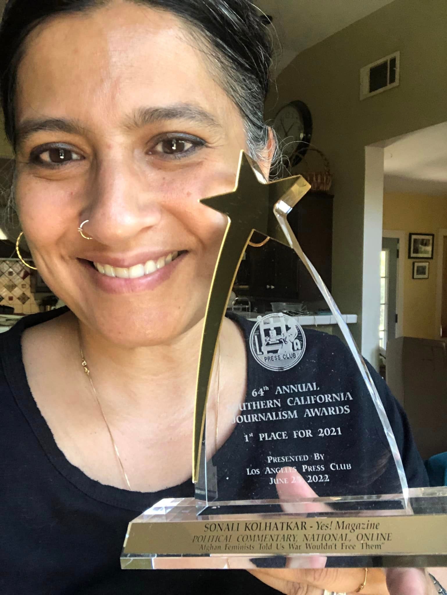 She won First Place at the Los Angeles Press Club Annual Awards for Best National Commentary Political Online (2022) for her YES! story, "Afghan Feminists Told Us War Wouldn’t Free Them." LA Press Club judges remarked, "This searing assessment of U.S. policy in Afghanistan focuses on the women who tried to make America understand it was fueling, not stopping, the Taliban. A stunning work that arguably belongs on some desks in Washington."