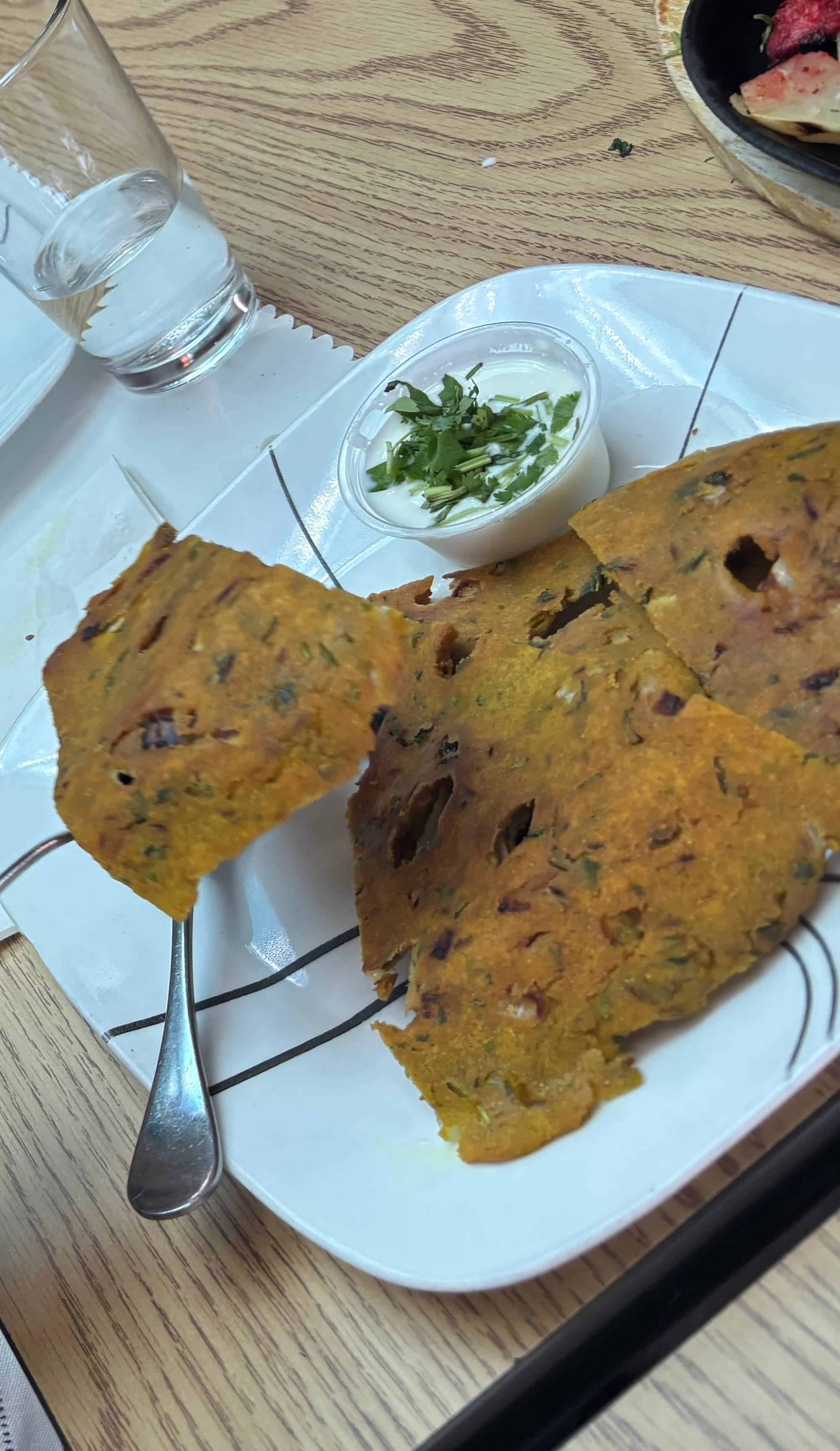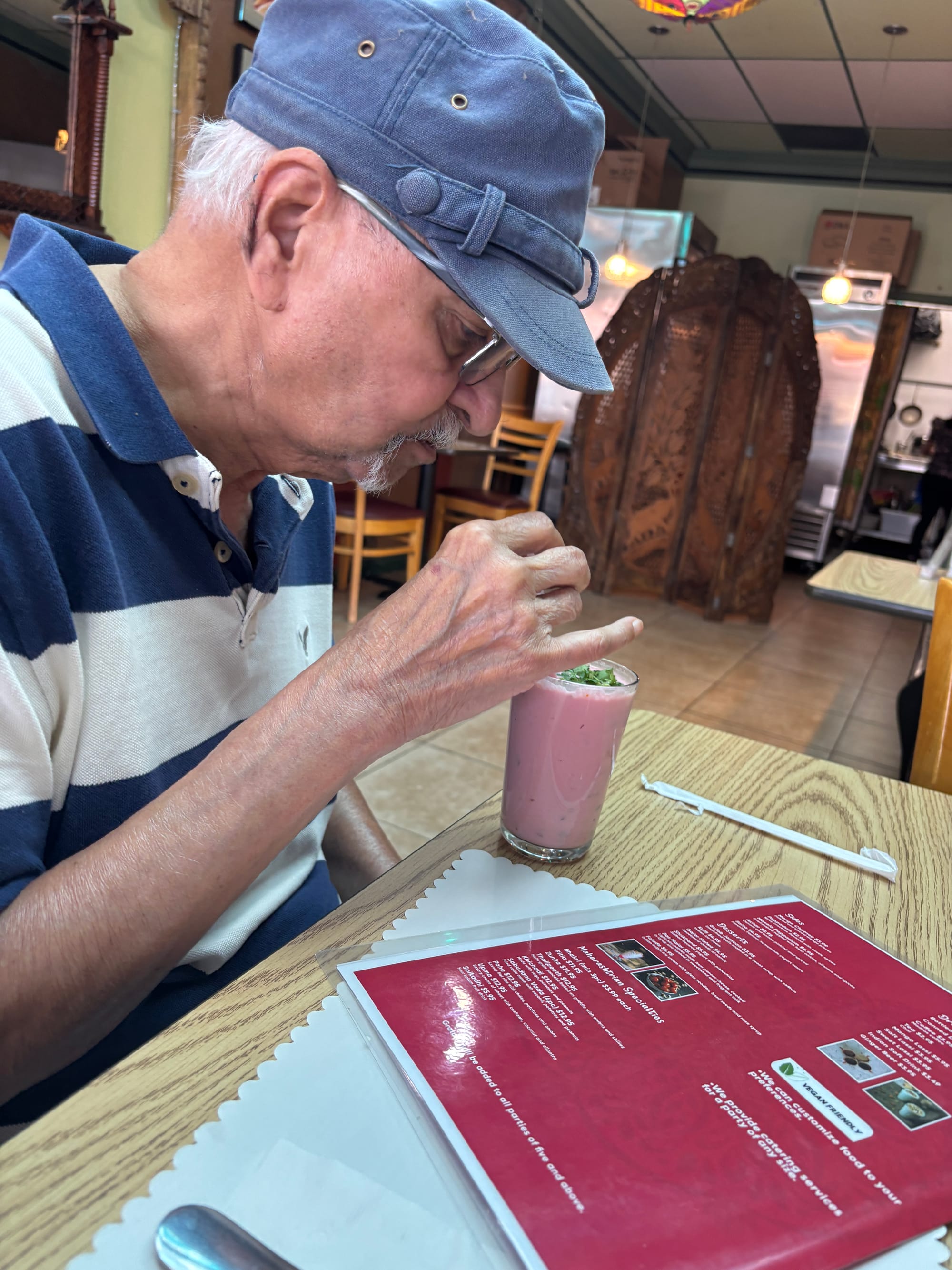 "Thalipeeth" on the left. My father savoring a glass of "solkadhi" a sour drink made with coconut milk and mangosteen